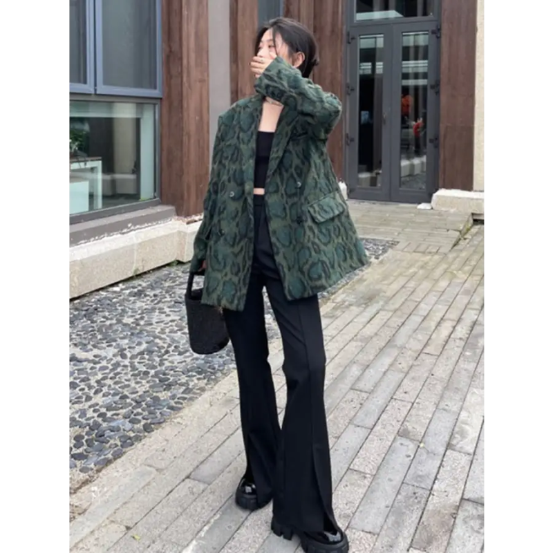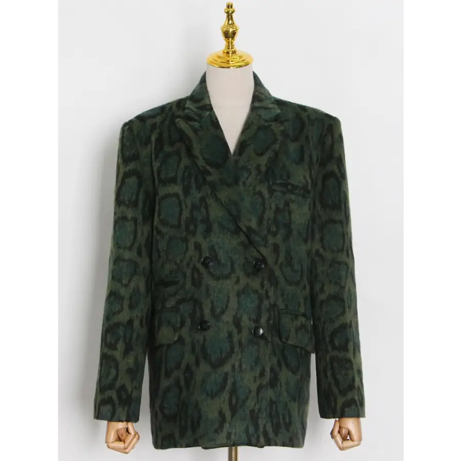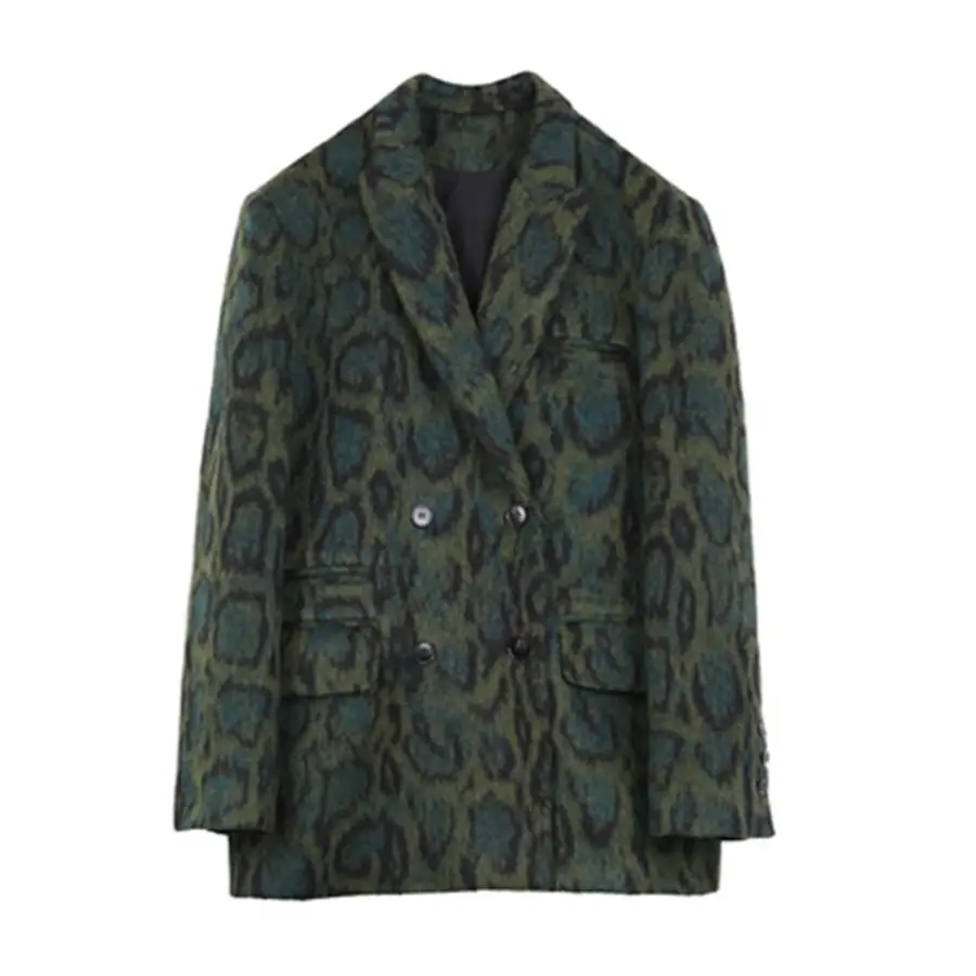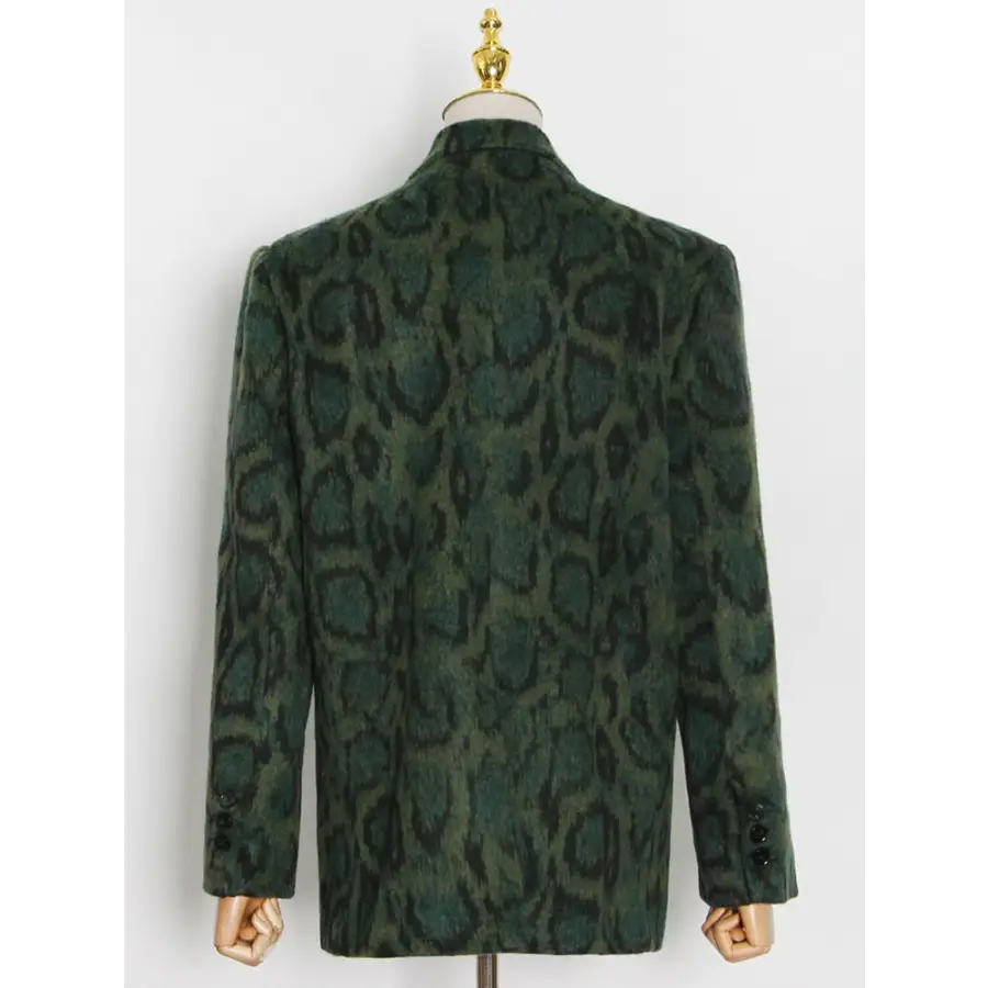 Affirmez votre style avec ce blazer ample à motif léopard vert. Véritable pièce maîtresse, il se distingue par son confort et son élégance. Idéal pour jouer sur les superpositions, il arbore des manches longues et des boutons sur le devant, lui conférant un look de costume subtil. Portez-le par-dessus un crop top et un pantalon taille haute pour une tenue à la fois sophistiquée et décontractée.